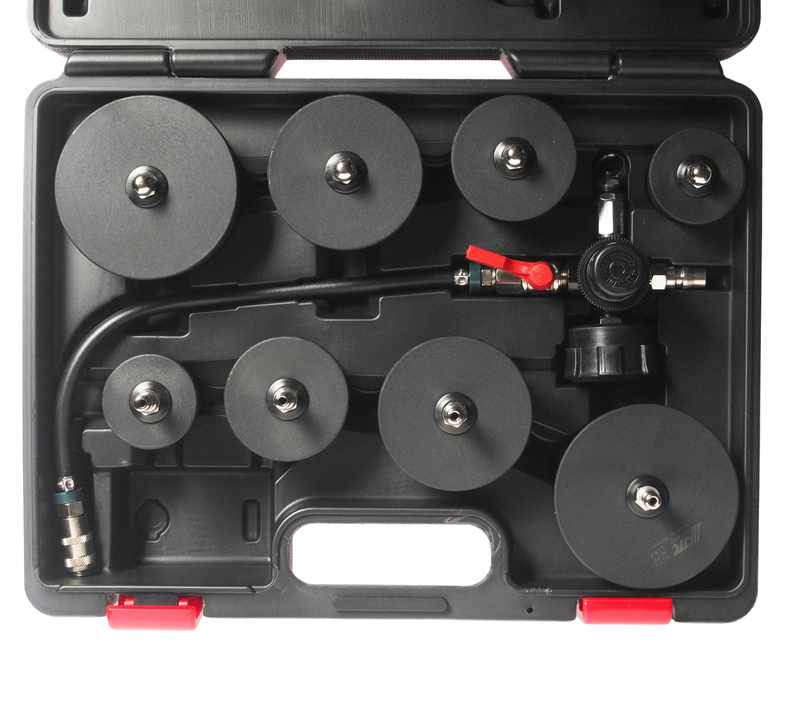 Комплектация Детектор утечек с манометром (макс 25 psi/1.7 бар) - 1 шт. Переходники - 8 шт. Описание В комплект входит 4 пары переходников, что способствует применению детектора с патрубками различных диаметров. Подходит для систем низкого давления. Возможно использование с шлангами системы охлаждения. Технические характеристики Рабочее давление: 1,5 кг/см². Размеры переходников, в мм (х2 шт. каждого): Ø80/85/90; Ø65/70/75; Ø50/55/60; Ø35/40/45.