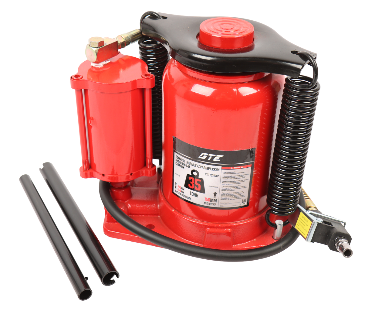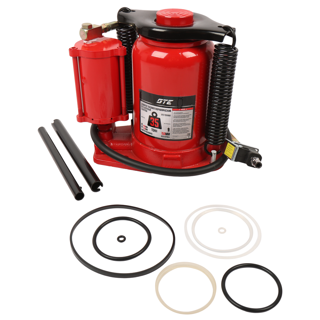 Домкрат бутылочный пневмогидравлический GTE-TQ35002 предназначен для поднятия грузов при помощи ручного или пневматического привода. Домкрат отличается компактностью конструкции, простотой обслуживания и надежностью в эксплуатации. Он позволяет осуществлять плавный подъем груза благодаря высокому передаточному отношению между площадями поперечного сечения цилиндра и плунжера насоса. Широкое опорное основание позволяет использовать домкрат на любой поверхности, включая мягкий грунт.