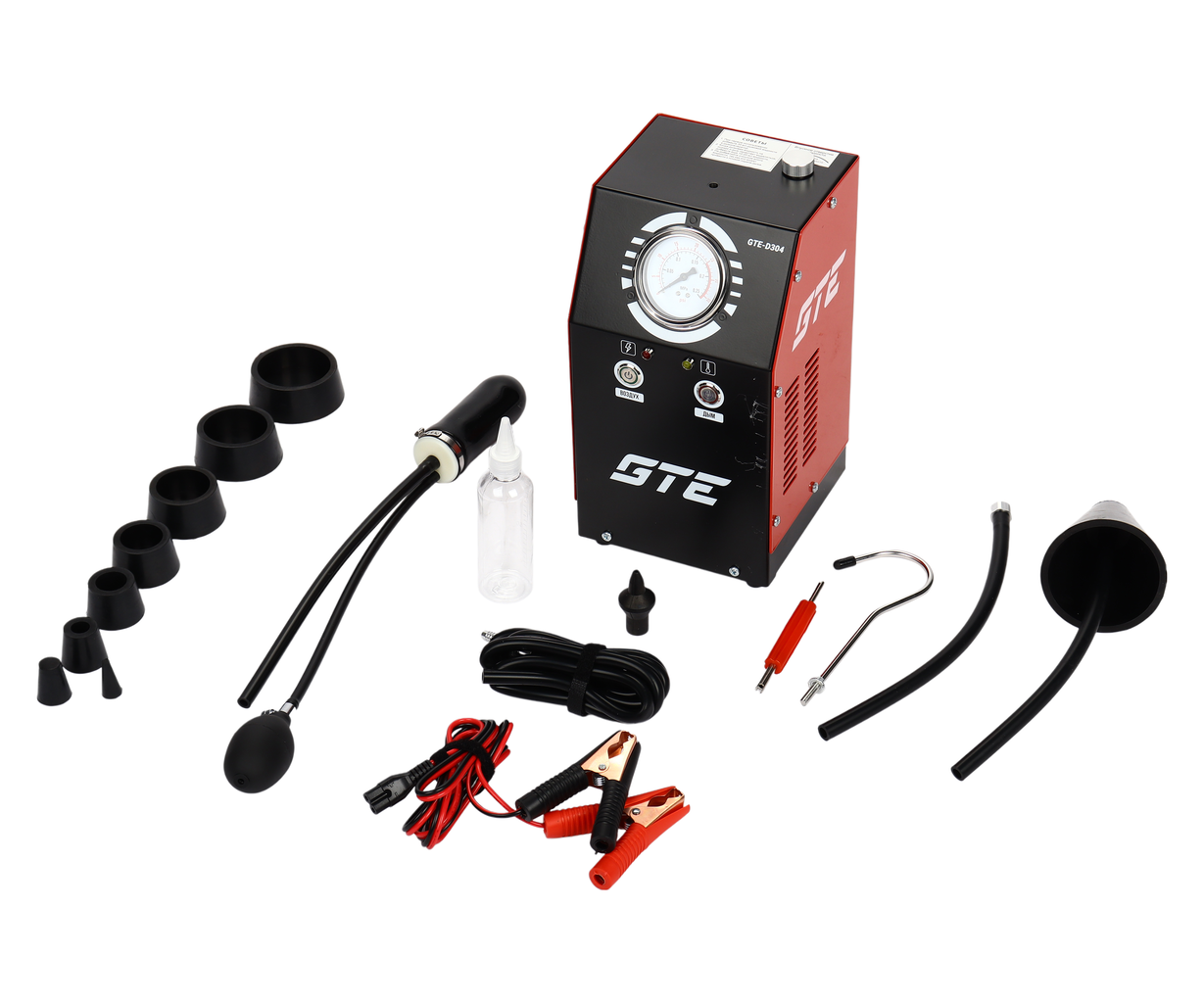 Дымогенератор GTE-D304 со встроенным компрессором — специальное диагностическое оборудование для оперативной диагностики автомобиля и эффективного обнаружения проблемы утечек «подсосов» воздуха в различных системах, требующих герметичность.