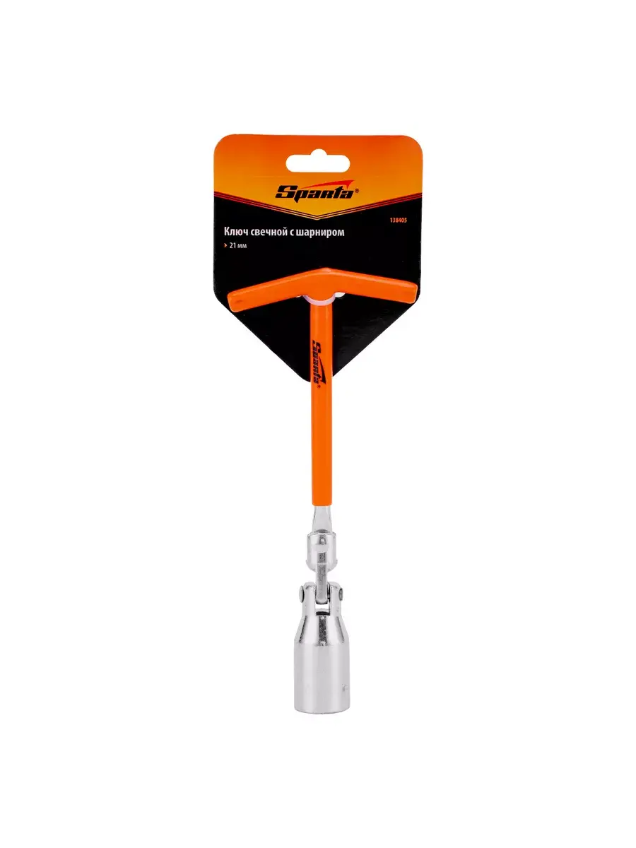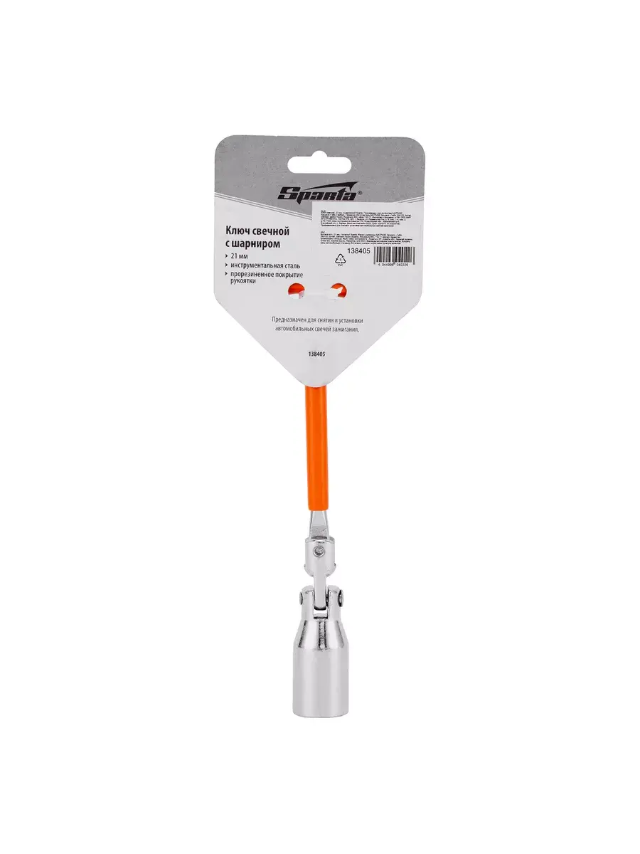 Ключ свечной карданный, 21 мм, с шарниром Sparta 138405. Ключ свечной карданный - это инструмент, который необходим для обслуживания двигателя автомобиля. Он представляет собой специализированный ключ, который используется для замены свечей зажигания в двигателе с карданным валом. Этот ключ имеет особую конструкцию, которая позволяет легко и безопасно достигать свечей зажигания, расположенных в труднодоступных местах. Ключ свечной карданный является важным инструментом для тех, кто занимается ремонтом и обслуживанием автомобилей. Благодаря этому ключу можно быстро и эффективно заменить свечи зажигания, что способствует более плавной работе двигателя и улучшению его производительности. Особенностью ключа свечной карданный является его удобство использования и надежность. Благодаря специальной форме и размеру, этот ключ позволяет легко и точно дотянуться до свечей зажигания, не повреждая при этом другие элементы двигателя. Кроме того, материал, из которого изготовлен ключ, обеспечивает его долговечность и стойкость к коррозии. Использование ключа свечной карданный делает процесс замены свечей зажигания более безопасным и эффективным. Благодаря этому инструменту можно быстро и качественно провести техническое обслуживание двигателя, что способствует его долговечности и надежной работе. Ключ свечной карданный - незаменимый помощник для автолюбителей и профессионалов в области автомобильного сервиса.