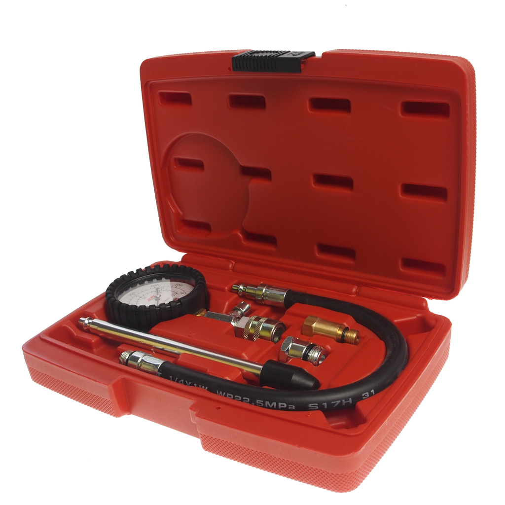 Комплектация Манометр – 1 шт. Алюминиевый стержень с резиновым кожухом - 1 шт. Удлинительный шланг – 1 шт. Адаптеры (12 мм/18 мм) – 2 шт. Описание Применяется для измерения компрессии бензиновых двигателей. Благодаря удлинительному шлангу, позволяет использовать компрессометр в труднодоступных местах. Манометр в резиновом кожухе, с легкочитаемой цветной шкалой. Стержень с резиновым кожухом, подходит ко всем диаметрам свечных отверстий. Технические характеристики Диапазон измерений составляет: 0-300 psi, 20 кг/см, 20 бар. Манометр, диаметр: 635 мм. Шланг, длина 380 мм; диаметр 14 мм. Стержень, длина: 200 мм. Применение Volkswagen, Mercedes-Benz, BMW, Mitsubishi, Nissan, Citroen, Opel, Peugeot, Renault, Fiat, Isuzu, Toyota, Seat, Volvo, Land Rover, Mazda, Ford. Принцип работы При подключении прибора к цилиндру (через свечное отверстие или отверстие для форсунки) давление подается через открытый запорный клапан на манометр, а в моменты падения давления (при движении поршня к НМТ) клапан закрывается, сохраняя давление в трубке компрессометра. Это дает возможность оценивать давление, которое возникает в камере сгорания на очень короткий промежуток времени. После проведения измерения давление в трубке сбрасывается нажатием на кнопку, и стрелка манометра устанавливается на нулевое деление шкалы. С помощью измерения компрессии можно определить сразу несколько основных параметров и показателей двигателя внутреннего сгорания: Состояние деталей цилиндро-поршневой группы и газораспределительного механизма (в том числе компрессионных колец, зеркала цилиндра, клапанов, наличие повреждений головки и ГБЦ и т.д.). Однако конкретную причину утечек воздуха определить так невозможно - нужно проводить более тщательную проверку, а иногда разборку двигателя и осмотр; Верность установки фаз газораспределения.