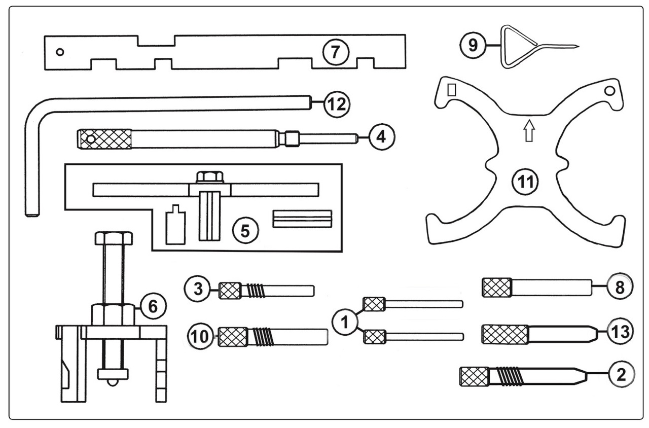 Комплектация Фиксатора шестерни ТНВД (2 шт.) (5,8 мм). ОЕМ 21-260 / 303-732 Фиксатор коленчатого вала. ОЕМ 21-163 / 303-620 Фиксатор коленчатого вала. ОЕМ 21-210 / 303-507 Фиксатор коленчатого вала. ОЕМ 21-104 / 303-193 Фиксатор маховика. ОЕМ 21-168 / 303-393 Съемник шестерни распределительного вала. ОЕМ 21-229 / 303-651 Установочная планка для распределительных валов. ОЕМ 21-162B / 303-376 / 303-376B Фиксатор маховика (9,4 мм). ОЕМ 21-262 / 303-734 Фиксатор ролика натяжителя ремня Ford. ОЕМ 303-1054 Фиксатор коленчатого вала Ford. ОЕМ 303-748 Фиксатор шестерни распределительных валов Ford. ОЕМ 303-1097 Фиксатор маховика. ОЕМ 303-1059 Фиксатор шестерни распределительного вала (8 мм). ОЕМ 0194B / 21-263 / 303-735 Описание Данный комплект фиксаторов позволяет проводить корректную установку фаз ГРМ двигателя при замене приводного ремня. Применение FORD 1.25, 1.4, 1.6, 1.7, 1.8 & 2.0 Twin Cam 16v. DURATEC бензиновый двигатель (ремень и цепь): Cougar 2.0 (98-01) Fiesta 1.25/1.4/1.6 (95-08) Focus 1.4/1.6/1.8/2.0 (98-08), 1.6 VCT-Ti (04-09) C-Max 1.8/2.0 (02-08), 1.6 VCT-Ti (04-09) Fusion 1.25/1.4/1.6 (02-08) Mondeo 1.8/2.0 (98-08) Puma 1.7 (97-02) Tourneo Connect 1.8 (02-06) Transit Connect 1.8 (02-06) Коды двигателей: AODA/B, ASDA, ASDB, CFBA, CGBA/B, CHBA/B, (бензин) CJBA/B, CSDA/B, DHA, DHB, DHC, DHD, DHE, DHF, DHG, EDBB, EDBD, EDDB, EDDC, EDDD, EDDF, EYDB, EYDC, EYDD, EYDE, EYDF, EYDG, EYDI, EYDJ, EYPA, EYPC, F8JA, F8JB, FHA, FHD, FHE, FHF, FUJA, FUJB, FXDA/C, FXDB/D, FXJA, FXJB, FYDA/C, FYDB/D, FYJA, FYJB, HWDA, HWDB, L1F, L1J, L1L, L1N, L1Q, L1T, L1V, L1W, M7JA, M7JB, MHA, MHB, NGA, NGB, NGC, NGD, QQDA/B/C, QQDB, RKA, RKB, RKF, RKH, RKJ, RKK, HXDA. FORD 1.4, 1.6 TDCi, 1.8 Di/TDCi/TDdi, 2.0 TDCi DURATORQ дизель (ремень): Courier 1.4/1.6/1.8 (00-02) Fiesta 1.4/1.6/1.8 (02-09) Focus 1.6/1.8/2.0 (98-00) C-Max 1.6/2.0 (03-08) Fusion 1.4 (02-08) Galaxy 2.0 (06-08) Mondeo 2.0 (07-08) S-Max 2.0 (06-08) Tourneo Connect 1.8 (02-08) Transit Connect 1.8 (02-08) Коды двигателей: F6JA, F6JB, F6JC, HHJA, HHJB, G8DA, HHDA, (дизель) HHDB, RTN, RTQ, RTP, C9DC, BHDA/B, BHPA, C9DA/B, F9DA/B, FFBA, FFDA, HCPA, HCPB, KKDA, P7PA, P9PA, QYWA, R2PA, R3PA, RWPA, G6DA, G6DB, G6DC, AZWA, QXWA. Так же для двигателей Duratorq, устанавливаемых на Mazda 2, 3 и моторы PSA 1.4, 1.6 с индексом Hdi.