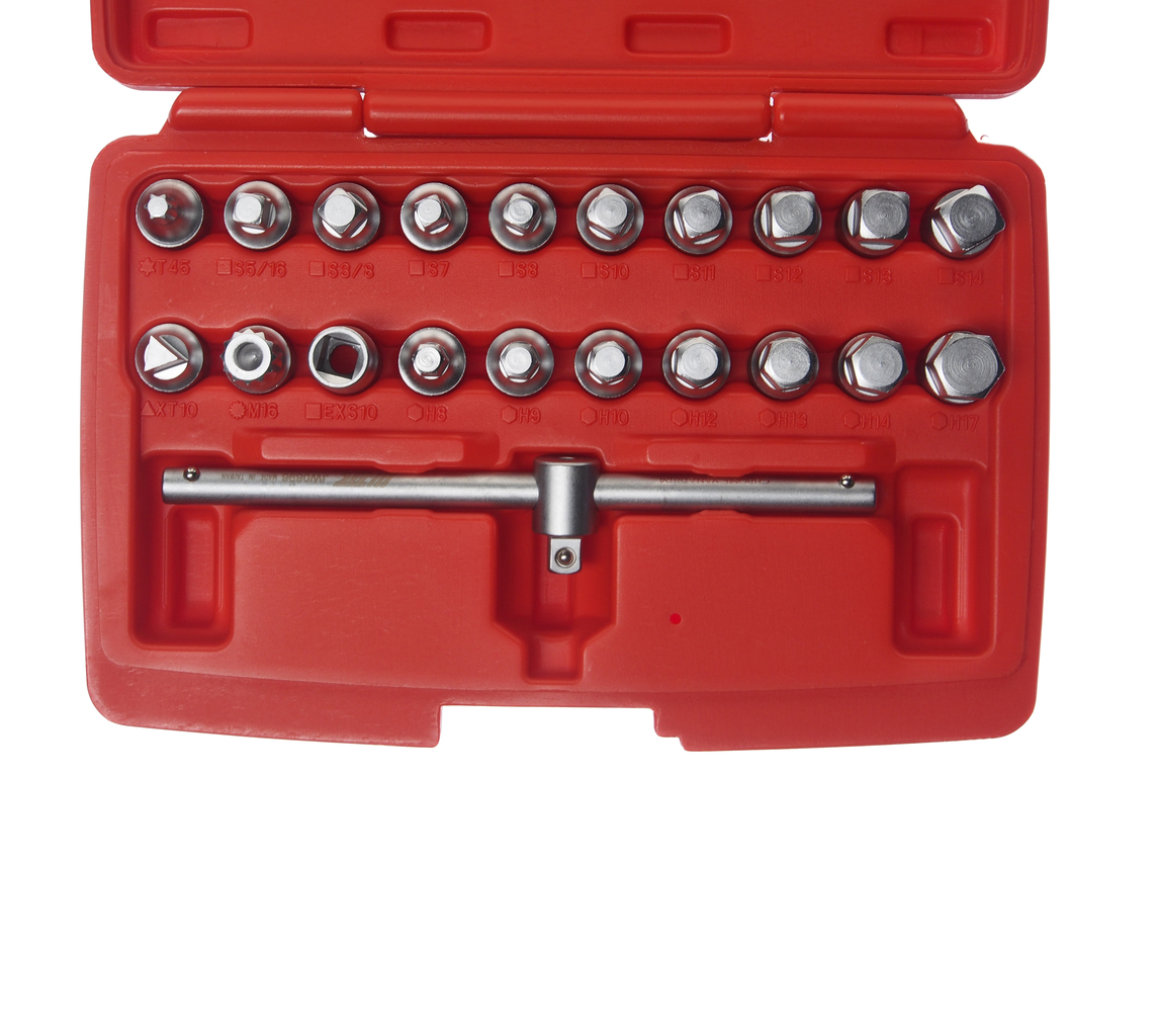 Предназначены для отворачивания масляных пробок. В комплекте: головки (17 шт.) Т45, S5/16, S3/8, S7, S8, S10, S11, S12, S13, S14, XT10, M16, EXS10, H8, H9, H10, H12, H13, H14, H17. Переносной пластиковый кейс.