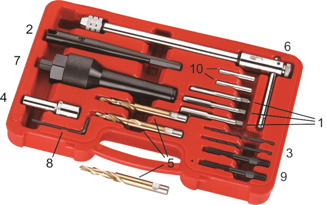 Комплектация Метчики: М8х1.0; 1/4NF28; М10х1 — 3 шт.; Буровая установка (цилиндр для удержания сверла) — 1 шт.; Сверла: Ø3.5 — 2 шт.; Адаптер для откручивания свечи (под квадратный ключ) — 1 шт.; Специальные ступенчатые сверла различного диаметра: 7х5.5, 9х5.5, 8х5.5 — 3 шт.; Т-образный вороток — 1 шт.; Устройство для извлечения свечи (используется с №9) — 1 шт.; Г-образный шестигранный ключ — 1 шт.; Шпилька для чистовой прогонки резьбы — 2 шт.; Втулка для центровки сверла — 2 шт. Описание Набор профессионального инструмента для извлечения свечей накаливания и восстановления резьбы в их колодцах, а также для высверливания шпилек, болтов, свечей зажигания. Адаптер под квадратный ключ применяется для снятия головки свечи накаливания. Для надежной фиксации адаптера на головке свечи используется молоточек. Набор также применяется для высверливания и извлечения болтов, шпилек, свечей зажигания и т.д. В набор входят сверла различного диаметра, втулки, конусы, а также метчики для восстановления резьбы. Общее количество предметов: 17. Порядок работы Удалить из свечи оставшийся центральный стержень; Вставить в колодец свечи направляющую трубку (конус-центр) — для этого из него необходимо извлечь резьбовой стержень и гайку; Собрать буровую установку (вставить в нее сверло соответствующего диаметра, саму установку вставить в дрель); Произвести сверление — во время этой операции, благодаря ступенчатому устройству сверла, будет высверлена резьбовая часть свечи, а внутренний канал свечи будет высверлен до необходимого для дальнейшей работы диаметра; С помощью Т-образного воротка и метчиков произвести нарезку резьбы внутри свечи; Через направляющую трубку вкрутить в свечу нарезной стержень, сверху закрутить гайку; Медленным закручиванием гайки извлечь свечу (это устройство выступает в роли домкрата — при закручивании гайки стержень будет подниматься, и тащить за собой свечу); Восстановить резьбу для вворачивания свечи. Важные рекомендации Перед началом работ со свечой извлеките форсунку соответствующего цилиндра. Через адаптер подключите компрессор и создайте давление в цилиндре, чтобы стружка и грязь не попали в него во время работы. При нарезании резьбы метчиком необходимо обеспечить подачу масла — так резьба получится более качественной и ровной. При нарезании резьбы необходимо соблюдать строгую центровку.