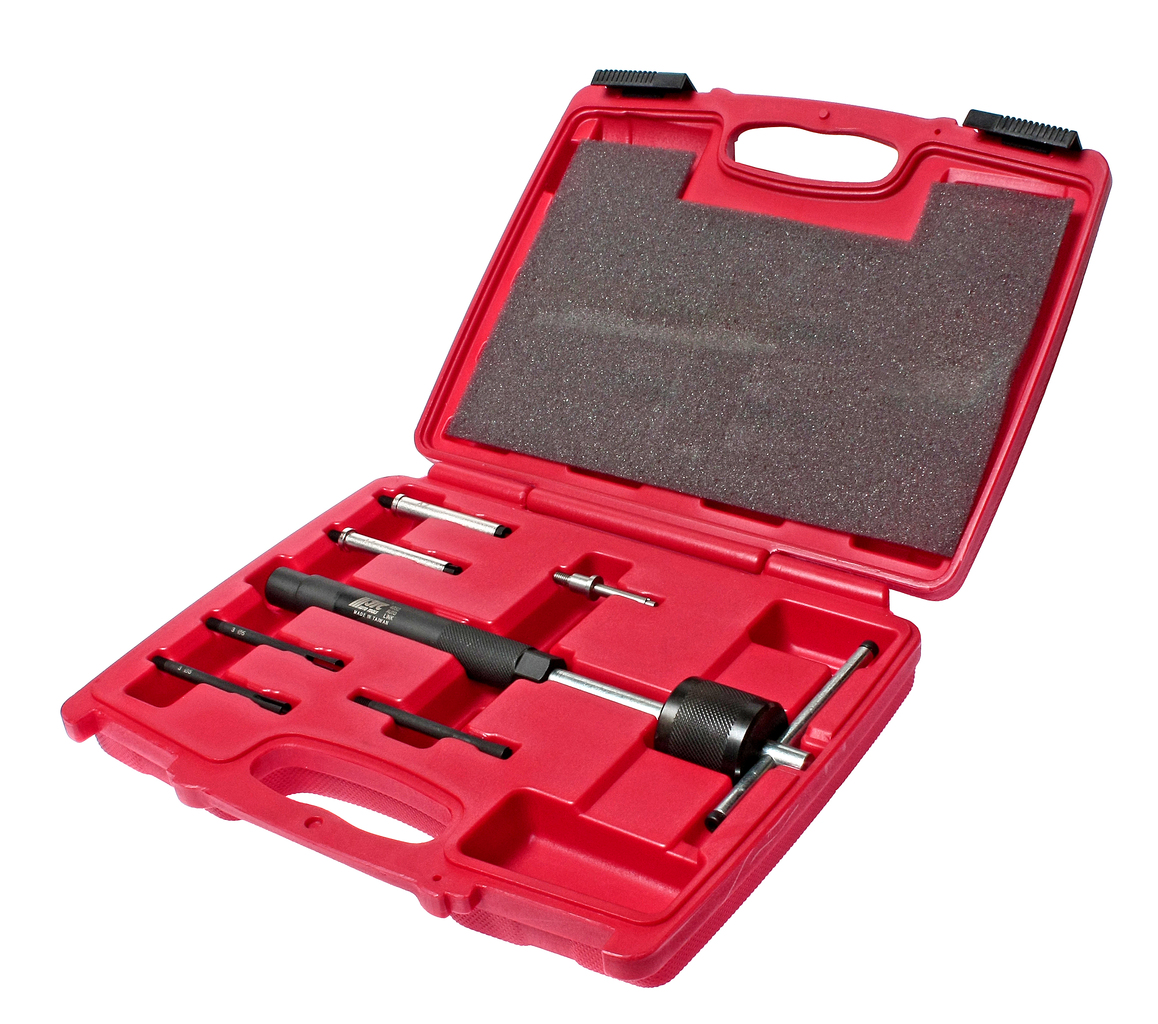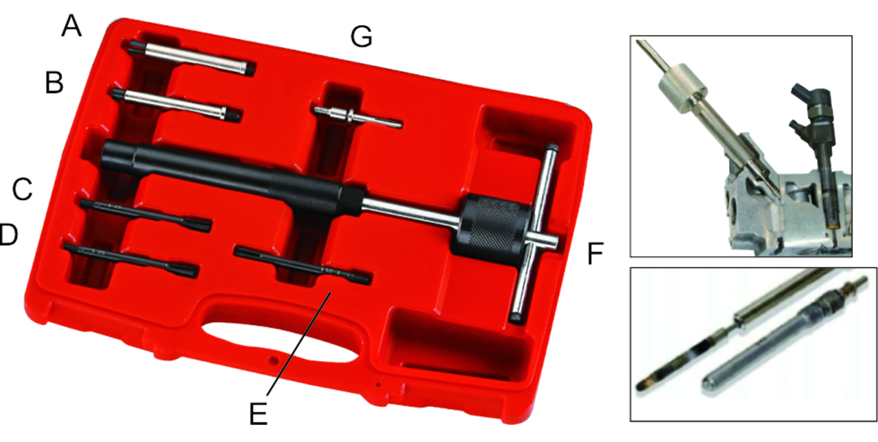 Комплектация (A) Съемник цанговый. Размер: 6.0 мм. (внутренний Ø - 7.7 мм.) (B) Съемник цанговый. Размер: 5.0 мм. (внутренний Ø - 6.8 мм.) (C) Съемник цанговый: Размер: 5.0 мм. (D) Съемник цанговый: Размер: 3.6 мм. (E) Съемник цанговый: Размер: 2.7 мм. (F) T-образный держатель. (G) Съемник цанговый внутренний. Описание Набор предназначен для извлечения закоксованных и сломанных свечей накаливания. В комплект входит съемник для демонтажа поврежденных свечей. Порядок работы Снимите электрический разъем свечи накаливания. Открутите свечу накаливания. Выберите подходящий цанговый съемник. Вкрутите его в Т-образный держатель. Установите держатель со съемником на свечу накаливания. Начинайте прокручивать рукоятку Т-образного держателя по часовой стрелке. Для дальнейшего извлечения свечи начинайте работать обратным молотком. Свеча начнет извлекаться. Извлечение сломанных свечей накаливания: Просверлите в оставшейся части свечи накаливания по центру отверстие. Вкрутите внутренний цанговый съемник (G) в Т-образный держатель. Установите держатель со съемником в свечу накаливания. Начинайте прокручивать рукоятку Т-образного держателя по часовой стрелке. Для дальнейшего извлечения свечи начинайте работать обратным молотком. Свеча начнет извлекаться.