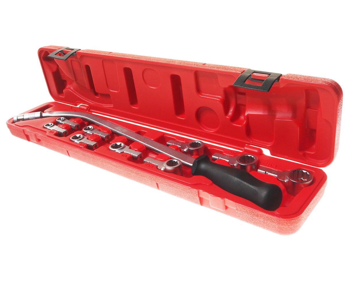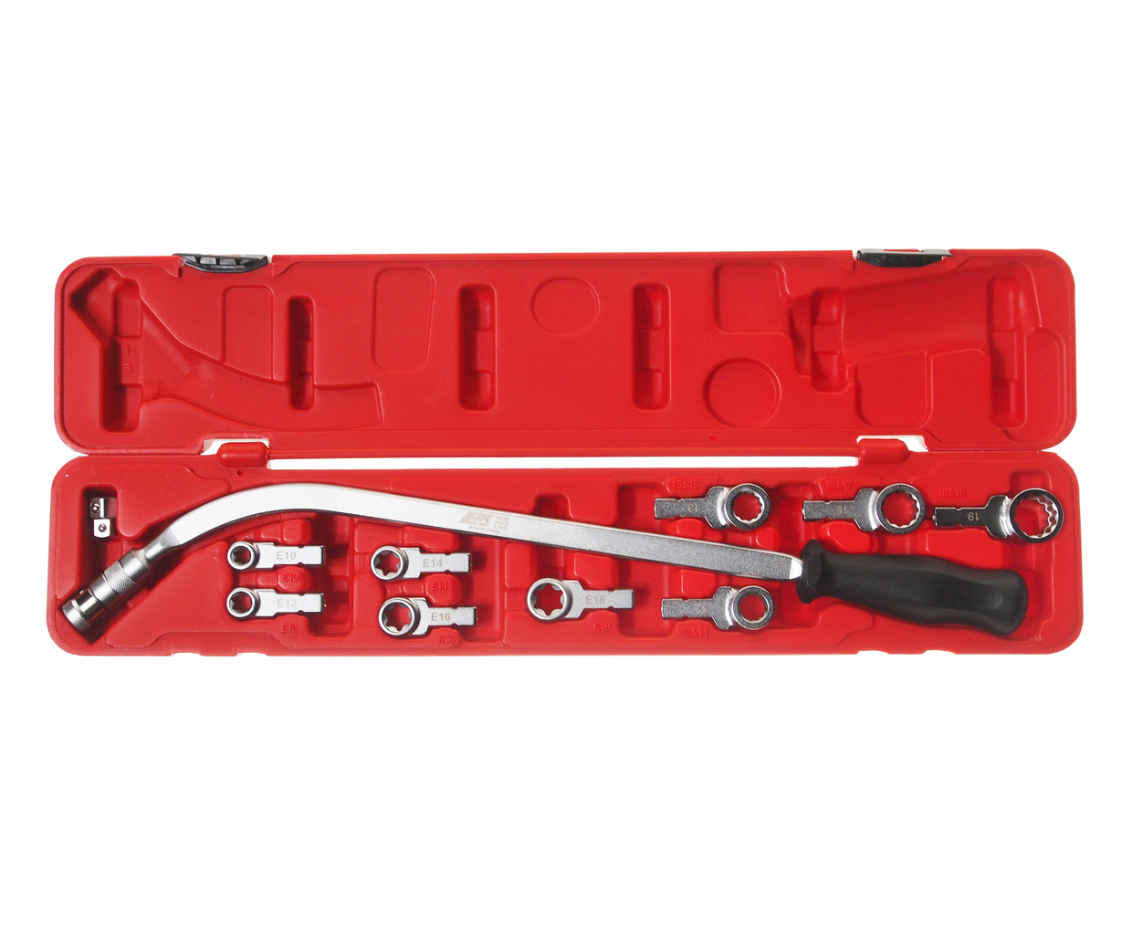 Набор универсален в применении благодаря 13 адаптерам, входящим в комплект. Специально разработан для использования в ограниченном пространстве. Адаптеры: двусторонние 12, 13, 14, 15, 16, 17, 18, 19 мм; односторонние Е10, Е12, Е14, Е16, Е18.
