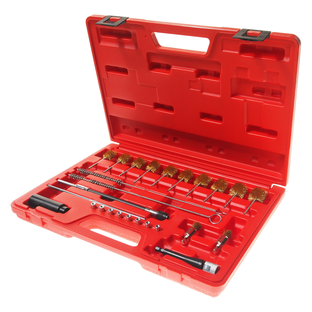 Используется для очистки посадочных мест форсунок дизельных автомобилей. В комплекте: 10 шт. - медные щетки: 18, 19, 21, 24, 26 х 2 шт. каждого размера. 1 шт. - щетка для очистки: 9 х 100 мм.; 2 шт. - щетки: 300 мм. Х 2 шт.; 1 шт. - гибкий держатель; 1 шт. - адаптер щетки с держателем; 1 шт. - опорный элемент; 2 шт. - щетки металлические для очистки посадочных мест форсунок; 8 шт. - заглушки; 1 шт. - пластиковая втулка для щетки.