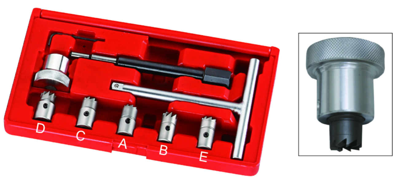 Комплектация (A) 15x19 мм плоский универсальный расширитель. (B) 17x17 мм плоский расширитель для форсунок Delphi/Bosh (BMW, PSA, RENAULT, FORD). (C) 17x19 мм плоский расширитель для форсунок Bosh (Mercedes BENZ CRD). (D) 17x21 мм угловой расширитель для FIAT, IVECO. (E) 17 мм угловой расширитель для FIAT, IVECO, FORD. Держатель-направляющая для разверток; Т-образная рукоятка; Оправка; Шестигранный ключ для болта фиксации развертки на держателе. Описание Применяется для притирки седел форсунок дизельного двигателя для плотного прилегания новых форсунок. Притирка снижает риск "прорыва газа", который возникает из-за накопления нагара под форсункой, а также помогает избежать дальнейшей коррозии металла. Применяется для всех современных дизельных двигателей типа common rail. В результате использования инструмента производится очистка седла форсунки от нагара, сглаживаются микронеровности, и обеспечивается герметичная посадка форсунки. Порядок работы Выбрать фрезу необходимого типа и диаметра; Собрать инструмент — надеть фрезу на держатель-направляющую и зафиксировать с помощью болта (закручивается шестигранником); Вставить инструмент в гнездо форсунки; С помощью рожкового ключа или Т-образной рукоятки несколько раз прокрутить инструмент из стороны в сторону, при этом на инструмент необходимо прилагать небольшое усилие, направленное вниз; Завершить обработку при появлении матового металлического блеска на седле форсунки (обычно для этого требуется несколько прокручиваний, а вся операция занимает не более минуты).
