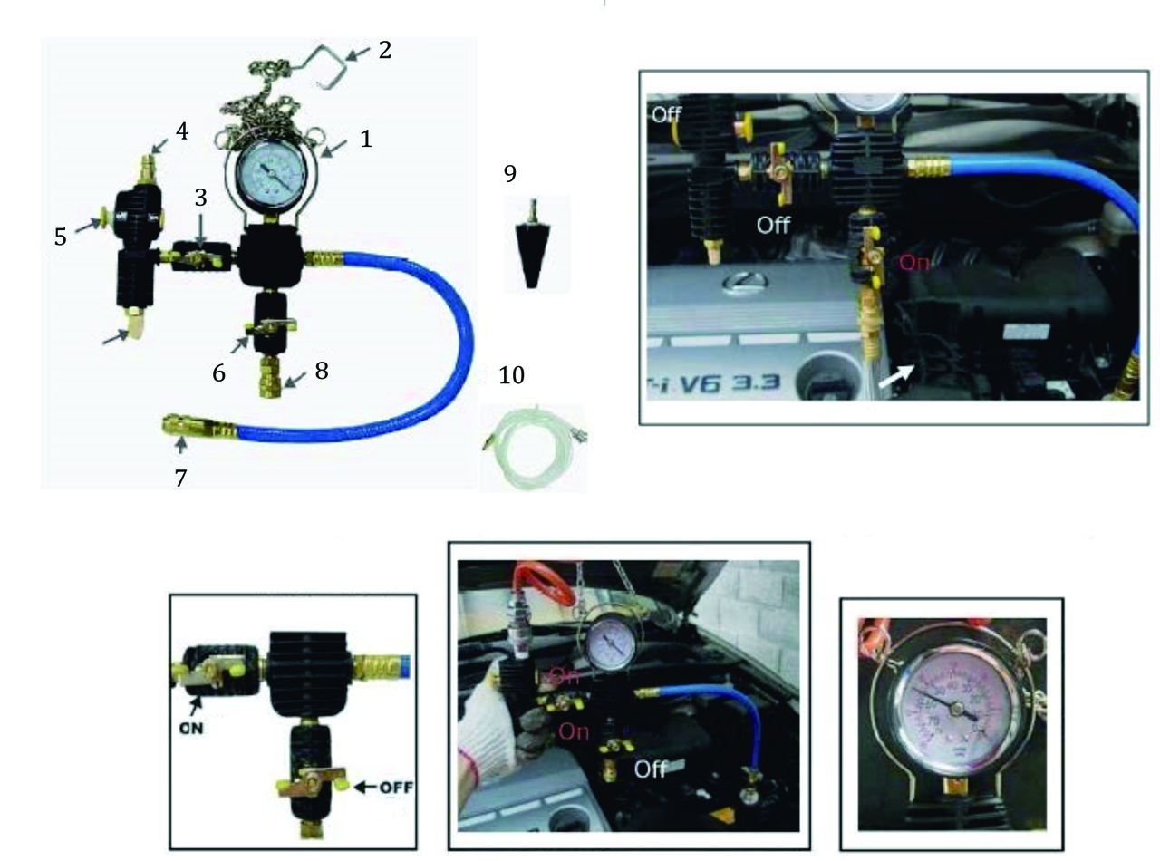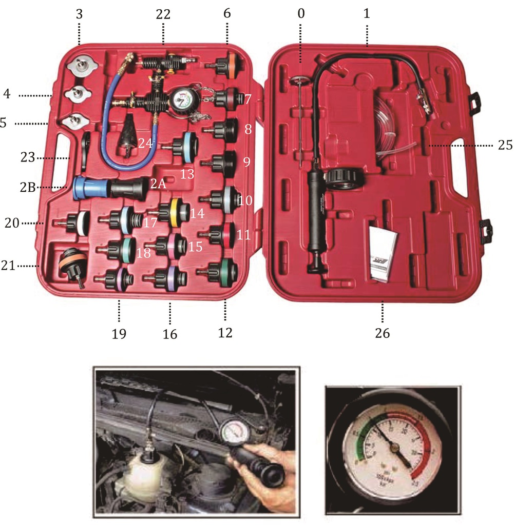 Комплектация 0. Термометр; 1. Ручной насос с манометром; 2А. Переходник R123/R124 (черный цвет); 2В. Переходник R123/R125 (синий цвет); 3. Поверочная крышка. Применение: Mercedes-Benz (W123, W124, W126, W201), GM (Buick), Jeep; 4. Поверочная крышка. Применение: Peugeot, Subaru, Chrysler, Acura, GM (Nova, spectrum, Sprint), Mitsubishi, Nissan, Mazda, Toyota, Infiniti, GEO, Suzuki, Isuzu, Mercedes-Benz; 5. Поверочная крышка. Применение: Honda, Toyota, Suzuki, Mitsubishi, Chrysler, Acura, Lexus; 6. Поверочная крышка. Применение: Mercedes-Benz (ML-class W163, W164), GM (achiva, skylark, gramd am-1992-2002); 7. Поверочная крышка. Применение: Volvo, Saab, Sterling, Citroen, Renault, Fiat, Alfa, Jeep, Mini; 8. Поверочная крышка. Применение: VW (Vento T4, Passat-1996, Golf, Beetle, Sharan); 9. Поверочная крышка. Применение: Audi (A4, A5, A6), BMW345, VW (Passat 1997-2002), Porsche (Cayenne); 10. Поверочная крышка. Применение: BMW (E46, E36, E34, E39, E38, E32, E90); 11. Поверочная крышка. Применение: Audi, VW; 12. Поверочная крышка. Применение: Ford Mondeo, Land Rover, Opel, Ssangyong; 13. Поверочная крышка. Применение: Mercedes-Benz (C-class, E-class, S-class, W140, W220, W124, W210, W211, W215, W216, W221, R230) 14. Поверочная крышка. Применение: Ford Mondeo, Focus, C-Max; 15. Поверочная крышка. Применение: Mazda (M3); 16. Поверочная крышка. Применение: Mercedes-Benz A-класс (W168); 17. Поверочная крышка. Применение: BMW (Е60, Е63, Е64, Е65); 18. Поверочная крышка. Применение: VW Sharan 1.8T, 2.8; 19. Поверочная крышка. Применение: Toyota Rav4, Previa; 20. Поверочная крышка. Применение: SAAB; 21. Поверочная крышка. Применение: Lincoln, Mercedes-Benz, Mercury, Oldsmobile, Pontiac, Opel, Buick, Cadillac, Chevrolet, GMC, Hummer, Jaguar, Land Rover. 22. Вакуумный манометр; 23. Пластиковый ключ для поверочных крышек; 24. Поверочная крышка универсальная; 25. Шланг (2 шт.). Описание Для работы с диагностическим набором для тестирования радиаторов не требуется специальная подготовка. Принцип данного набора прост: с помощью ручного насоса, который имеет быстроразъёмное соединение с ниппелем сброса давления, подключается при помощи специальной радиаторной крышки из набора. После чего создают давление в системе охлаждения двигателя. Утечка, в случае если она находится в радиаторе, в патрубке или в другом месте, сразу даст о себе знать. Благодаря манометру и ниппелю в насосе, возможно также наблюдать степень герметичности системы охлаждения двигателя, так как утечка охлаждающей жидкости может быть не явной. Поверочные крышки различных размеров позволяют работать с большинством моделей автомобилей. Материал: изготовлен из прочного и износостойкого пластика (Nylon 66).