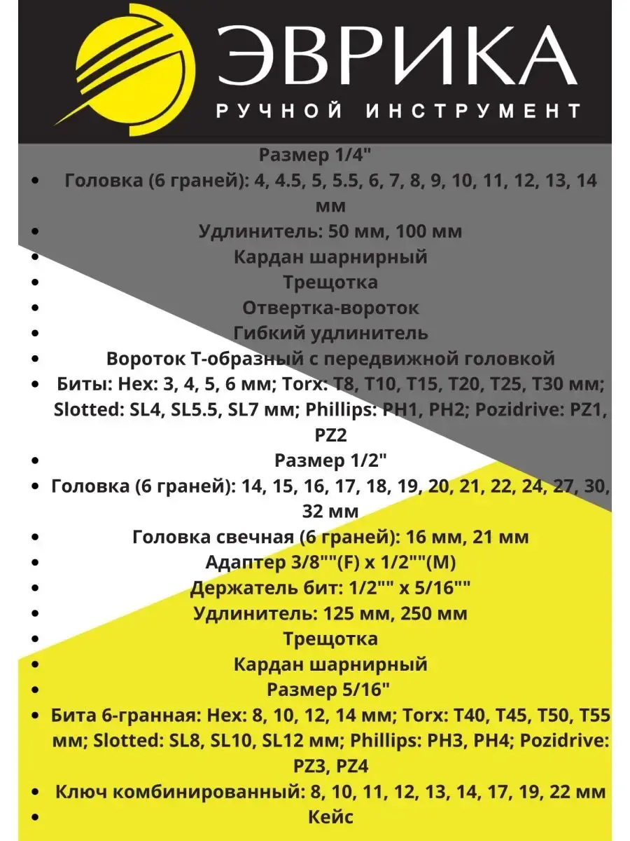 Наборы инструментов Эврика изготавливаются из высококачественного хромо-ванадиевого сплава. Автомобильные наборы инструментов предназначены как для ремонта автомобиля, так и для строительных целей. Многие покупатели по достоинству оценили высокое качество и наполнение автонаборов и специнструмента, произведенного брендом Эврика, и высказали множество положительных отзывов. Универсальные наборы инструментов, а также наборы головок, Эврика поставляются в удобных кейсах (чемоданах), где каждый элемент располагается в собственном месте, и не выпадает при транспортировке. Наиболее популярными сферами применения профессиональных наборов инструментов Эврика, являются автосервисы и частные мастерские. По причине постоянных высоких нагрузок на инструмент, владельцы автосервисов наиболее придирчиво подходят к выбору оборудования, и отдают предпочтение комплектам инструментов Эврика. Даже самый взыскательный покупатель сможет выбрать свой автоинструмент, ведь наборы инструментов комплектуются составом от 12 до 216 предметов. Наборы Эврика включают в себя весь спектр, необходимых в ремонте автомобиля, инструментов, а именно: торцевые головки, рожковые ключи, различные биты, трещотки и воротки. Некоторые наборы дополнительно имеют в составе молоток, пассатижи, переставные или обычные клещи, бокорезы и многое другое. Благодаря прочному и удобному кейсу, инструменты не будут разбросаны по всему багажнику, а будут аккуратно храниться в одном месте. Наборы инструментов Эврика – это отличный подарок на день рождение, новый год, 23 февраля или именины. Побалуйте подарком своего мужа, брата, папу или коллегу.