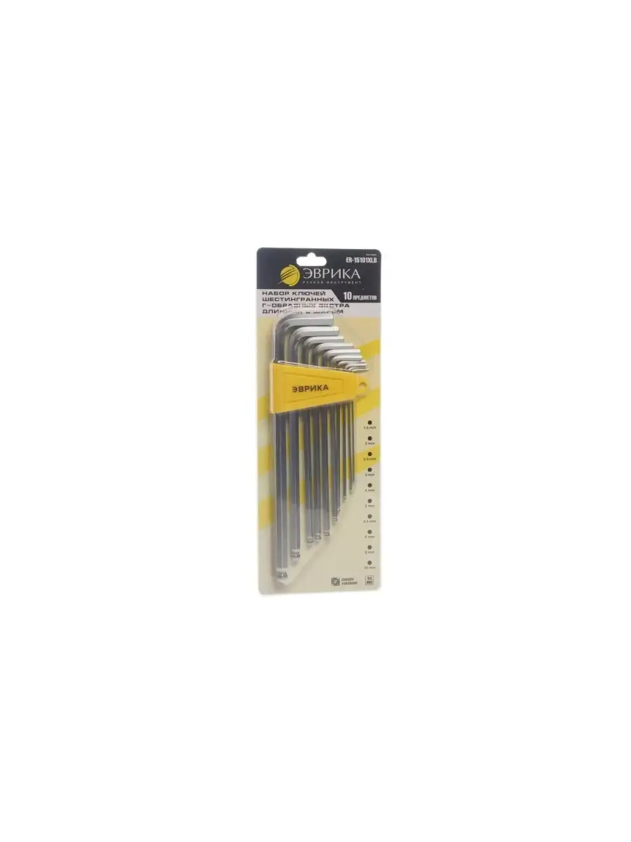 Набор шестигранных Г-образных экстра длинных ключей с шаром 1.5-10мм ЭВРИКА ER-15101XLB позволяет работать с автомобильным крепежом, а также винтами в различных сложных инструментах.Угловая форма создает оптимальный рычаг для вращения с небольшим усилием.