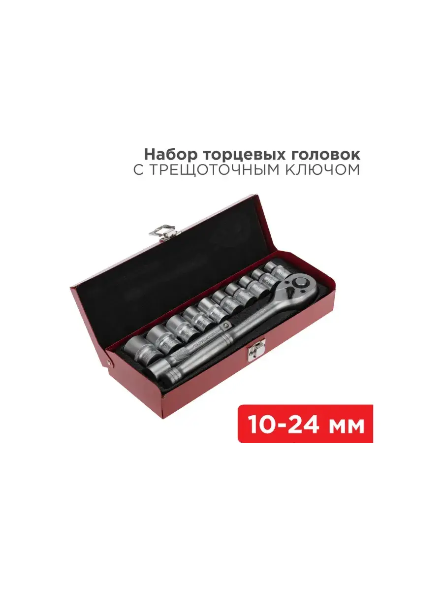 Набор торцевых головок 1/2, головки 10-24 мм, с трещоточным ключом, 12 предметов REXANT. Набор головок REXANT используется для монтажа и демонтажа резьбовых соединений. Инструменты изготовлены из хромованадиевой износостойкой и долговечной стали с хромоникелевым покрытием. В наборе 10 съемных торцевых головок: 10, 11, 12, 13, 14, 15, 17, 19, 22 и 24 мм, которые имеют 6-гранный зев и посадочное место для присоединительного квадрата 1/2”. В комплект входят: ключ-трещотка с переключателем и удлинитель 125 мм. Изделия поставляются в удобном металлическом кейсе.