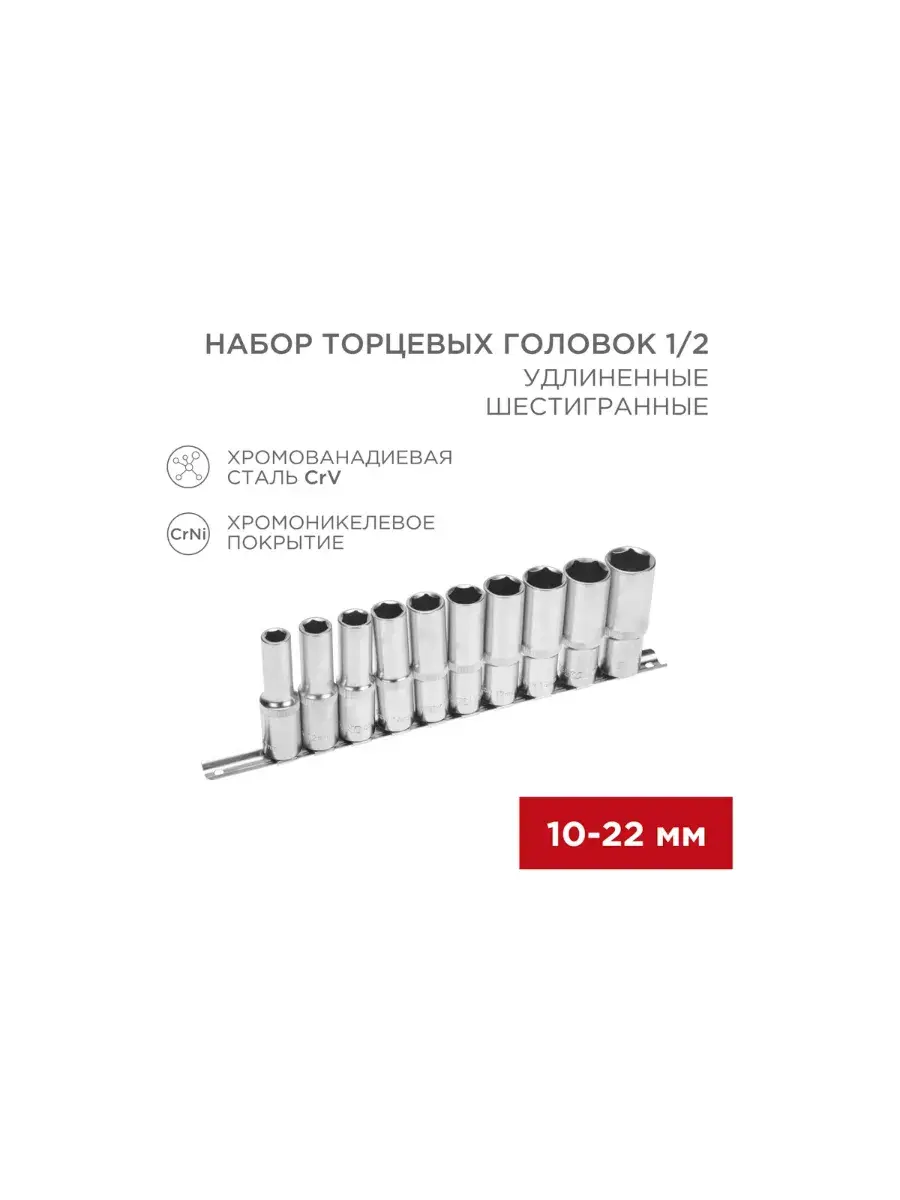 Набор удлиненных торцевых головок 1/2, шестигранные, CrV, 10 шт., 10-22мм REXANT. Набор головок REXANT используется для монтажа и демонтажа резьбовых соединений. Широко применяется при ремонте автомобилей и различного оборудования. Инструменты изготовлены из хромованадиевой износостойкой и долговечной стали с хромоникелевым покрытием. Твердость материала рабочей части головок – 42 HRС. В набор входят 6-гранные удлиненные торцевые головки на планке под квадрат 1/2" следующих размеров: 10, 12, 13, 14, 15, 16, 17, 19, 21 и 22 мм. Ярко-красная полоска, нанесенная на головки, предназначена для удобного поиска. Изделия поставляются на металлической планке и упакованы в блистер.