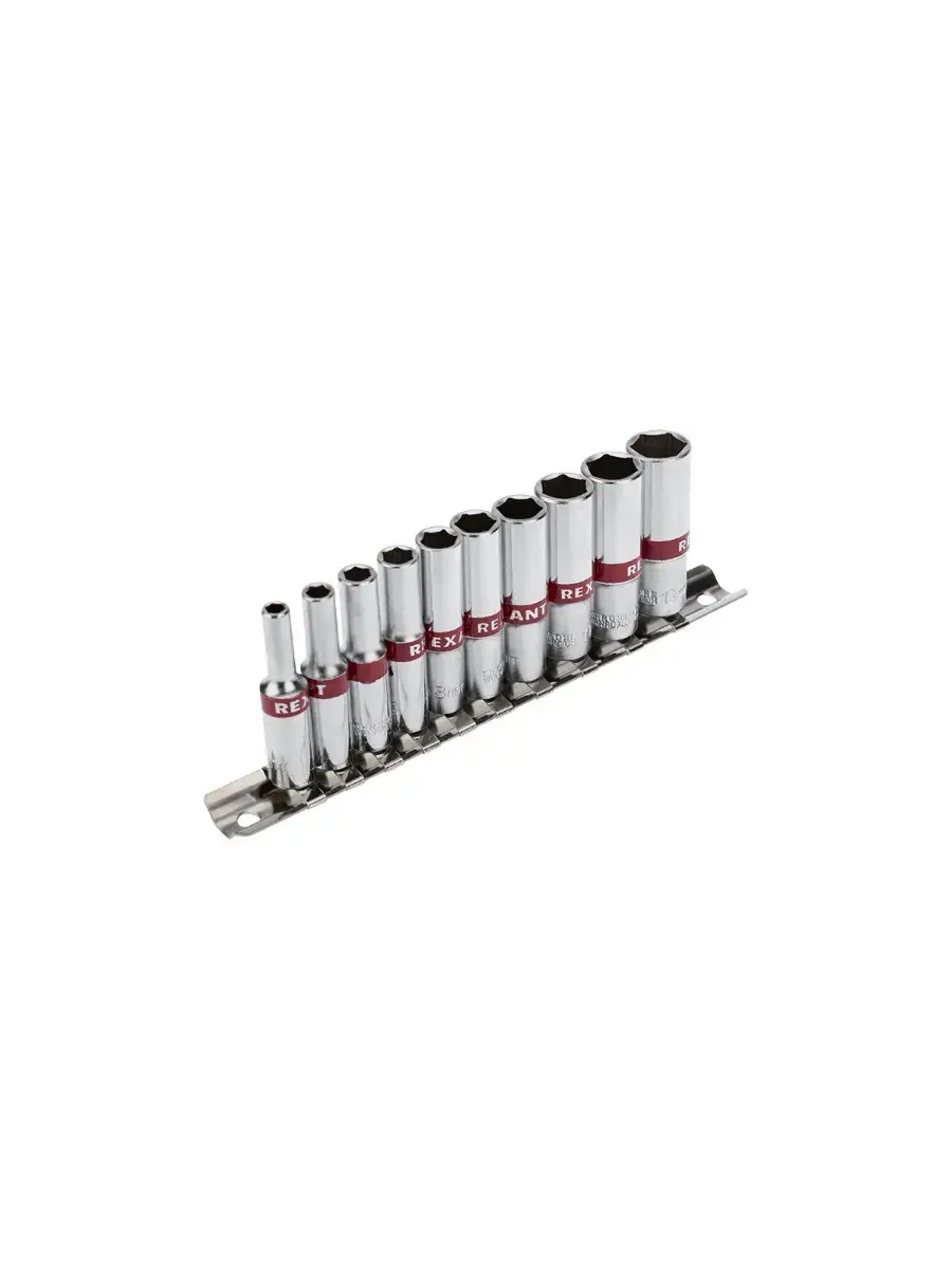 Набор удлиненных торцевых головок 1/4, шестигранные, CrV, 10 шт., 4-13мм REXANT. Набор удлиненных торцевых головок REXANT используется для монтажа и демонтажа резьбовых соединений. Широко применяется при ремонте автомобилей и различного оборудования. Инструменты изготовлены из хромованадиевой износостойкой и долговечной стали с хромоникелевым покрытием. Твердость материала рабочей части головок – 42 HRС. В набор входят 6-гранные удлиненные торцевые головки на планке под квадрат 1/4" следующих размеров: 4, 5, 6, 7, 8, 9, 10, 11, 12 и 13 мм. Ярко-красная полоска, нанесенная на головки, предназначена для удобного поиска. Изделия поставляются на металлической планке и упакованы в блистер.