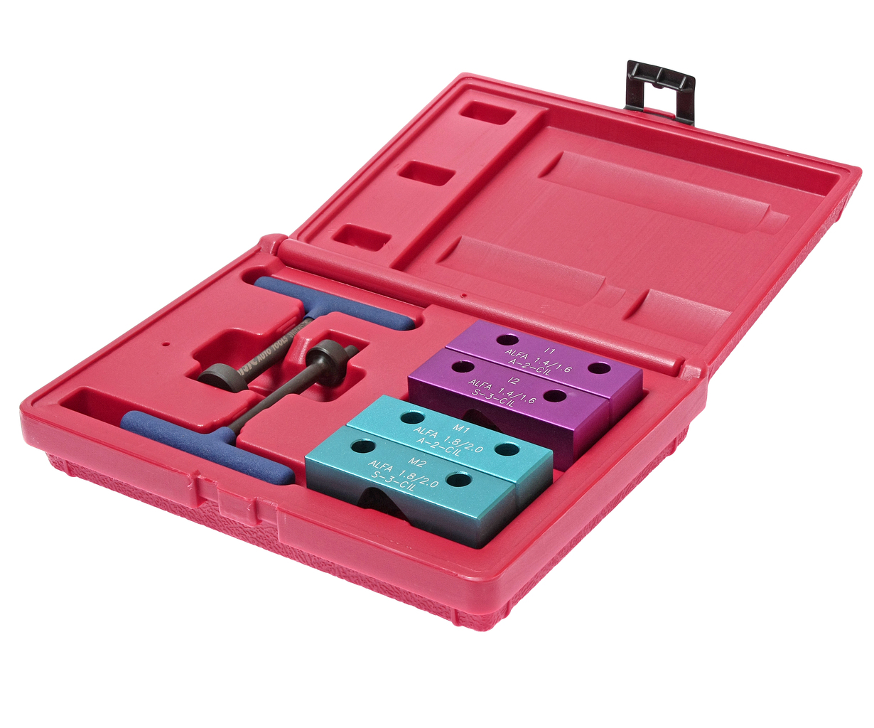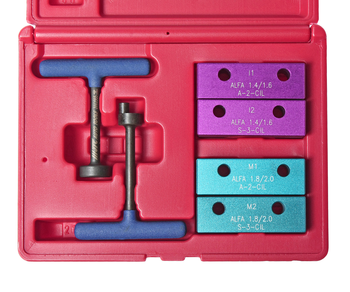 В наборе две пары кондукторов для распределительных валов и комплект специальных приспособлений для балансировочного вала. Применение: Альфа Ромео (Alfa Romeo) 145/146/155/156; годы выпуска 96 - 01, двигатели 1.4L и 1.6L. Общее количество предметов: 6. Упаковка: прочный пластиковый кейс. Габаритные размеры: 215/165/50 мм. (Д/Ш/В) Вес: 858 гр.