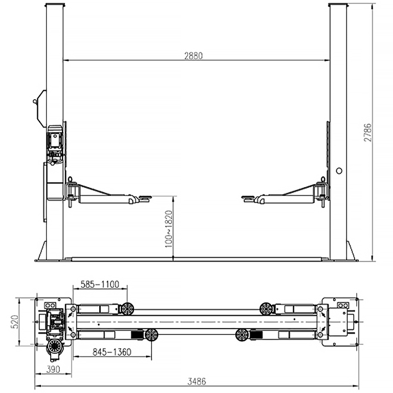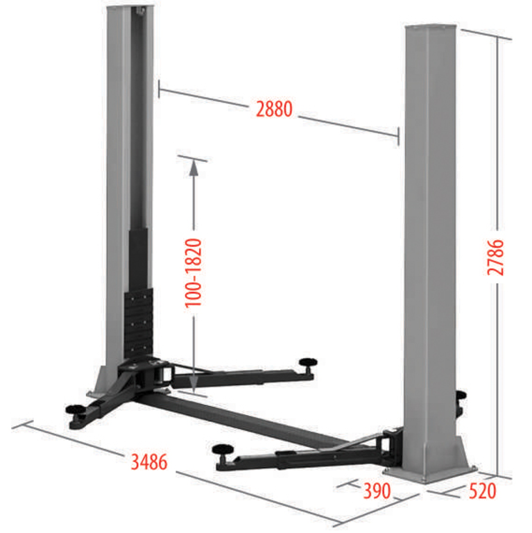 Двухстоечный подъемник с механическим спуском с 1 колонны GTE-H106 с нижней синхронизацией предназначен для обслуживания транспортных средств малой и средней весовых категорий общей массой до 4,5 тонн, используется в автомобильных сервисах и специализированных мастерских. Характеристики: Грузоподъемность: 4500 кг Синхронизация: нижняя Разблокировка стопоров: механ. с 1 колонны Время подъема/спуска, сек.: 50/15 Высота подъема (мин./макс.): 100/1820 мм Высота подъемника: 2786 м Ширина подъемника: 3486 мм Расстояние между стойками: 2880 мм Длина подхватов (мин./макс.): 3 секц. 585-1100 мм и 2 секц. 845-1360 мм Напряжение питания: 380В Потребляемая мощность: 3 кВт Проставки для рамных авто: 4х100 мм Анкерные болты: М18x180 мм Гидростанция: Bucher Brand Вес подъемника нетто/брутто: 600/620 кг Особенности: Толщина металла колонн 5 мм до покраски. Двух и трехсекционные подхваты. Разблокировка стопорных механизмов с одной колонны. Защитный короб для тросов и шланга, что увеличивает срок эксплуатации подъемника. Оцинкованный трос синхронизации толщиной 9,3 мм. Усиленная каретка, с размещенными внутри подхватами, позволила сократить минимальную высоту и увеличить эксплуатационный ресурс. Предохранительный клапан защищает систему от разрыва в случае превышения нагрузки. Крепления для хранения проставок. Цельная конструкция колонн обеспечивает максимальную устойчивость. Резиновые отбойники для дверей. Лотки для инструмента.