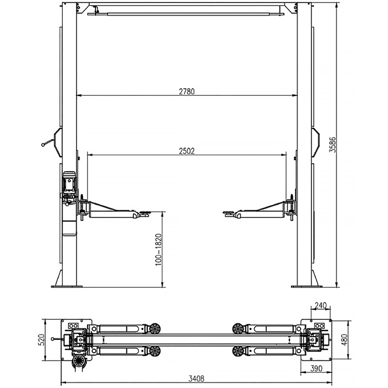 Двухстоечный подъемник с механическим спуском с 1 колонны GTE-B205 с верхней синхронизацией предназначен для обслуживания транспортных средств малой и средней весовых категорий общей массой до 4 тонн, используется в автомобильных сервисах и специализированных мастерских. Характеристики: Грузоподъемность: 4000 кг Синхронизация: верхняя Разблокировка стопоров: механ. с 1 колонны Время подъема/спуска, сек.: 50/15 Высота подъема (мин./макс.): 100/1820 мм Высота подъемника: 3586 мм Ширина подъемника: 3408 мм Расстояние между стойками: 2780 мм Длина подхватов (мин./макс.): 3 секц. 585-1100 мм и 2 секц. 845-1360 мм Напряжение питания: 220 В Потребляемая мощность: 2,2 кВт Проставки для рамных авто: 4х100 мм Анкерные болты: М18x180 мм Гидростанция: Bucher Brand Вес подъемника нетто/брутто: 650/670 кг Особенности: Толщина металла колонн 5 мм до покраски. Двух и трехсекционные подхваты. Усиленная каретка, с размещенными внутри подхватами, позволила сократить минимальную высоту и увеличить эксплуатационный ресурс. Предохранительный клапан защищает систему от разрыва в случае превышения нагрузки. Разблокировка стопорных механизмов с одной колонны. Низкопрофильные подхваты. Оцинкованный трос синхронизации толщиной 9,3 мм. Ограничитель подъема для предотвращения повреждения крыши автомобиля.