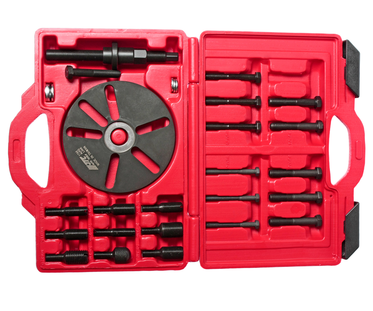 Профессиональное устройство для снятия и установки шкивов балансировочного вала. Встроенный подшипник делает работу более легкой и безопасной. Упорная пластина и комплект резьбовых переходников (9 шт.) делают возможным применение инструмента на большинстве двигателей. Диаметр круглой оправки: 125 мм. Упаковка: прочный переносной кейс. Количество в оптовой упаковке: 20 шт. Габаритные размеры: 270/215/50 мм. (Д/Ш/В) Вес: 2083 гр.