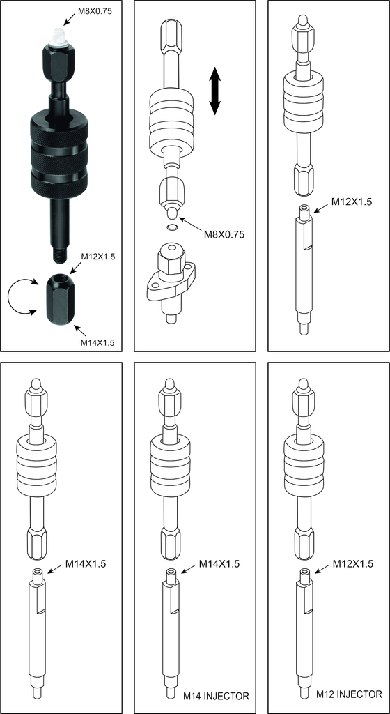 Съемник Комплектация Съемник форсунок – 1 шт. Адаптеры – 2 шт. Описание Применяется для снятия дизельных форсунок BOSCH и LUCAS. Подходит для демонтажа прикипевших форсунок. Применение инструмента значительно снижает риск повреждения форсунок. Комплектуется 2-мя адаптерами: первый М8, второй М12 на М14. Инструмент прост в применении и отличается высокой эффективностью. Резьба: М8х0,75, М12х1,5 для форсунок Bosch; М14х1,5 для грузовиков Volvo, Scania. Порядок работ Перед началом работы форсункк и колодец, в котором она находится, обработайте небольшим количеством смазки, а также при необходимости смажьте части съемника — это облегчает проворачивание форсунки и гаек инструмента; Установите инструмент на форсунку; С помощью динамометрического ключа наверните инструмент на форсунку; Обратным молотком усилие через инструмент передается форсунке до тех пор, пока она не начнет проворачиваться; Форсунка выкручивается из головки блока цилиндров; В случае если все сделано правильно и без превышения допустимых усилий, форсунка (а также уплотнительная шайба) легко извлекается из головки блока цилиндров.