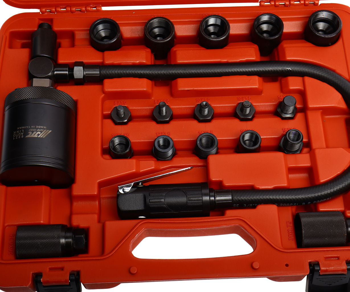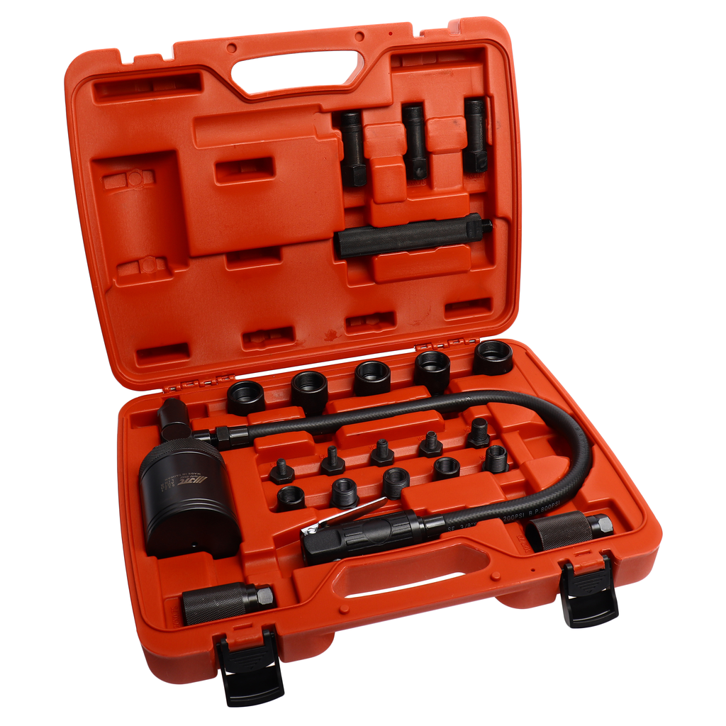 Пневматический съемник дизельных форсунок JTC — это профессиональный инструмент, предназначенный для демонтажа топливных форсунок в дизельных двигателях с помощью сжатого воздуха. Быстрый и безопасный демонтаж — минимизирует риск поломки форсунки или головки блока. Универсальность — подходит для большинства дизельных двигателей (легковых, грузовых, спецтехники). Простота использования — не требует больших физических усилий. Основные характеристики: Адаптеры: В комплект входят сменные адаптеры под разные размеры резьбы форсунок: M8, M10, M12, M14, M16, M17, M18, M20, M22, M25, M26, M27, M29, M31 (позволяет работать с большинством распространенных моделей дизельных форсунок). Размер пневматического пуллера (захвата): M14?P1.5 (подходит для стандартных форсунок). Принцип работы: Использует давление сжатого воздуха (пневматику) для плавного и безопасного извлечения форсунки без повреждений.