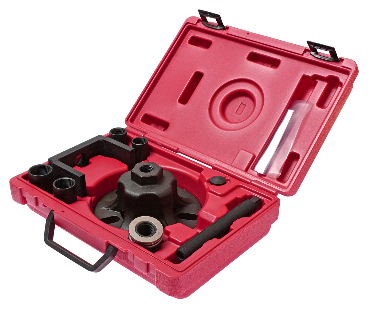 Способ применения: Зафиксируйте пластину в отверстиях колесного диска. Открутите болт, который фиксирует ступицу к приводном валу. Возьмите подходящий по размеру адаптер, затем зафиксируйте неподвижно приводной вал от коробки передач, приставьте рамку, зафиксируйте гайку и болт для дальнейшей работы по извлечению ступицы.