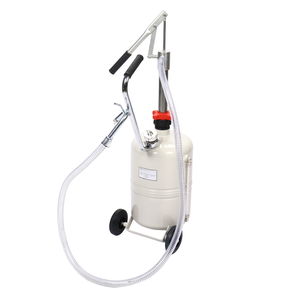 Установка для подачи масла GTE-T706024PRO с ручным приводом представляет собой стальную емкость объемом 24 л, c ручкой для удобства перемещения в помещении автосервиса, оборудована ручным насосом, который создает давление, необходимое для подачи масла и сходных материалов.