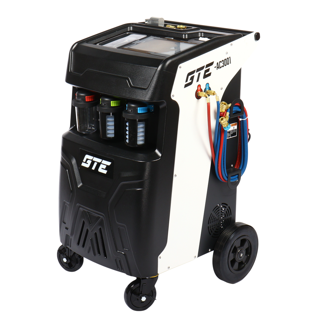 Универсальная автоматическая установка GTE-AC3001, применяется для заправки и диагностики систем кондиционирования автомобилей. Установка работает с фреоном R-134a и обеспечивает автоматизацию следующих операций: запуск и остановка рекуперации хладагента, вакуумирование системы, запуск и остановка заправки масла по времени, заправка хладагента по электронным весам, промывка системы автомобиля.